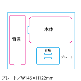 | 本体サイズ | プレート/W146×H122×D3(mm) 本体/W96×H57×D3mm 背景/W34×H110×D3(mm) 台座/W50×H37×D3(mm) |