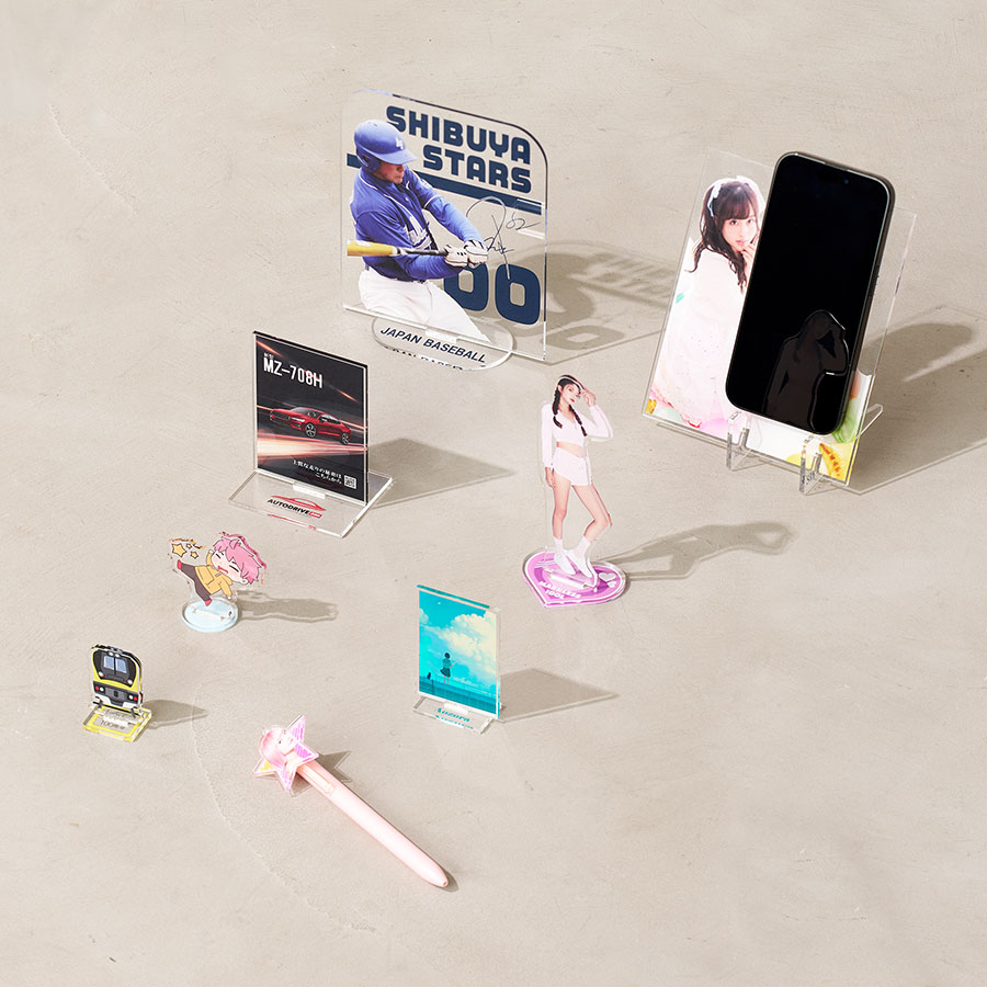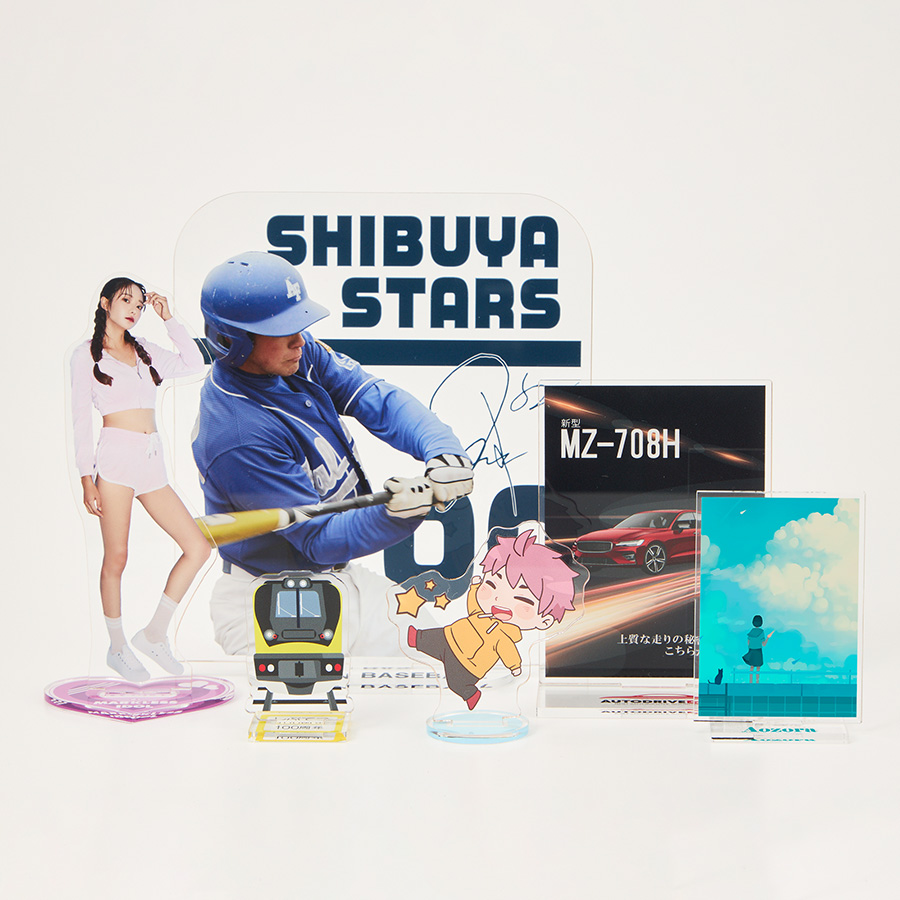 オリジナル型抜きで好きなカタチにできるアクリルスタンドです。