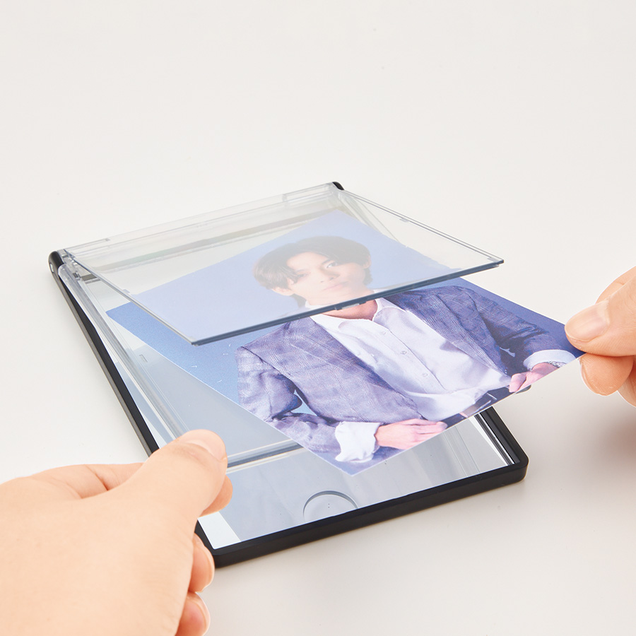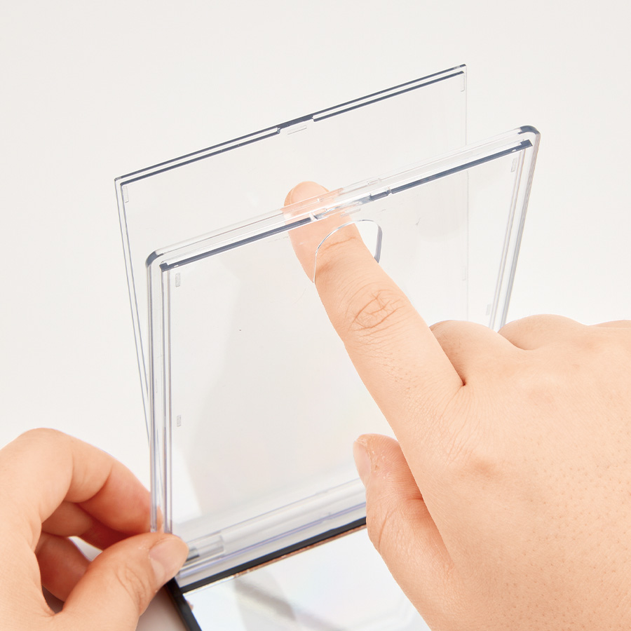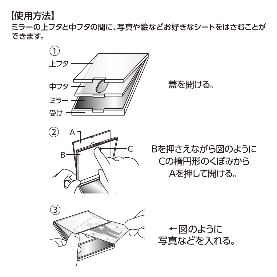 フタ部分にL版写真をセットすることで、オリジナルミラーが完成します。