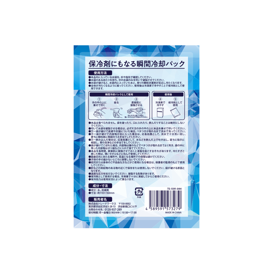 使い終わったあとは保冷剤としてもお使い頂ける瞬間冷却パックです。パン!と叩くだけで手軽に冷やせる瞬間冷却パックは、熱中症対策の必需品です。使用後は凍らせることで保冷剤としてお使い頂けるので、長くお使い頂けるアイテムとなっております。イベントのバラマキやスポーツクラブの備品などにおすすめの商品です。